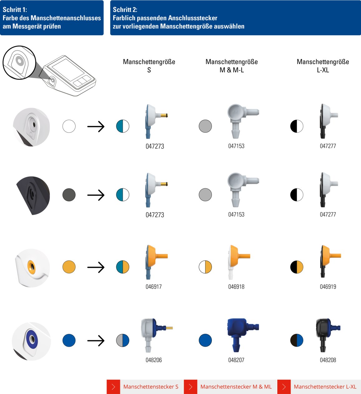 Hinweis: Bei Kauf einer Manschettenpackung (Übersicht verfügbarer Größen HIER) sind bereits Manschettenstecker für den Anschluss an verschiedene Gerätegenerationen inkludiert. Sollten Sie dennoch einen einzelnen Stecker benötigen, fragen Sie diesen bitte unter Angabe der unter dem benötigten Stecker angegebenen Artikelnummer über unser Kontaktformular an.